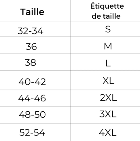 Si vous hésitez entre deux tailles, nous vous recommandons de choisir la taille supérieure afin de garantir un ajustement optimal.